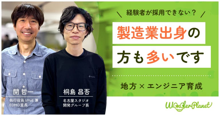 ゲーム開発経験者の採用難という課題を抱え、それを解決するために「業界未経験者の人が活躍できる環境づくり」に力を入れています。今回は、名古屋発のゲーム会社として注目を集めるワンダープラネット執行役員VPoE兼EDMO室長の開さん、名古屋スタジオ開発グループ長の桐島さんにいろいろなお話を伺いました。