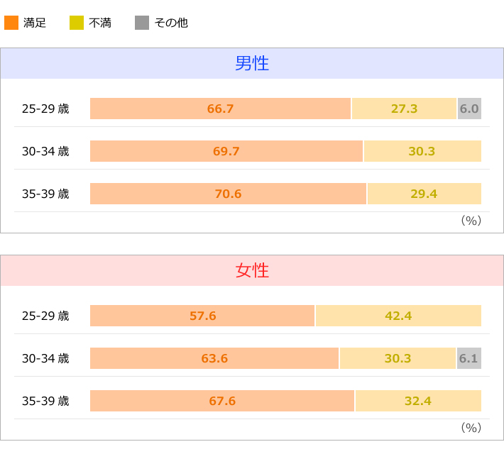 男性全体では「満足69%」、「不満29%」、女性全体では「満足63%」、「不満35%」と、女性のほうが不満に思っている人が多いですが、あまり大きな差はありませんでした。