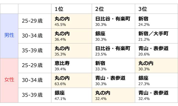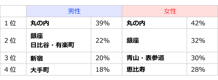 どの年代でも3位以内には「丸の内」がランクイン、男性ではどの世代でも1位は「丸の内」に。しかし、世代によって数値にバラつきがありました。特に20代後半・男性は45.5%と、ほかの男性層に比べて10%以上も多い結果となりました。